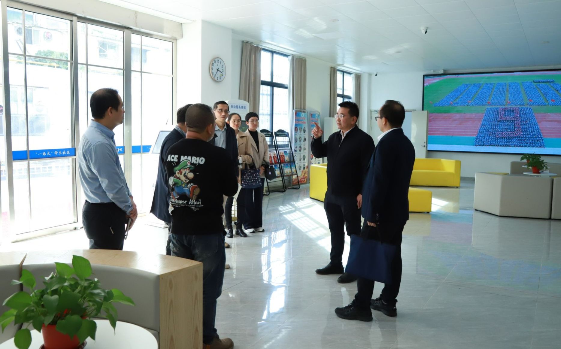 与会人员围绕创新创业政策、竞赛指导、招生就业、共青团工作等方面进行深入交流。在崔昌华的陪同下,海南外国语职业学院一行参观校园,来到“一站式”学生社区服务中心参观并了解学生服务工作情况。